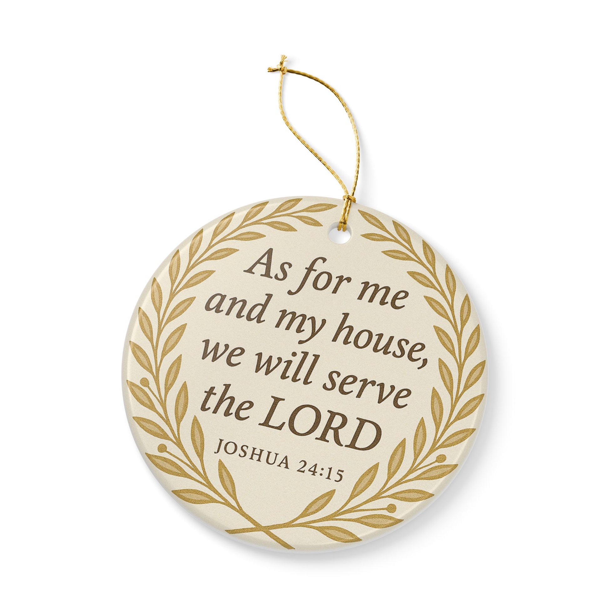 A warm, faith-centered ceramic ornament that brings a calm, homeward feeling to any room or tree. Soft cream tones and a delicate laurel wreath frame the scriptural line from Joshua 24:15 — "As for me and my house, we will serve the LORD" — printed in an elegant serif that reads like a quiet pledge. Lightweight but sturdy, the glossy ceramic surface catches light while the included gold string adds a subtle touch of celebration. Hang it in an entryway, on a mantel, or among evergreen branches to create a steady reminder of home, faith, and belonging.