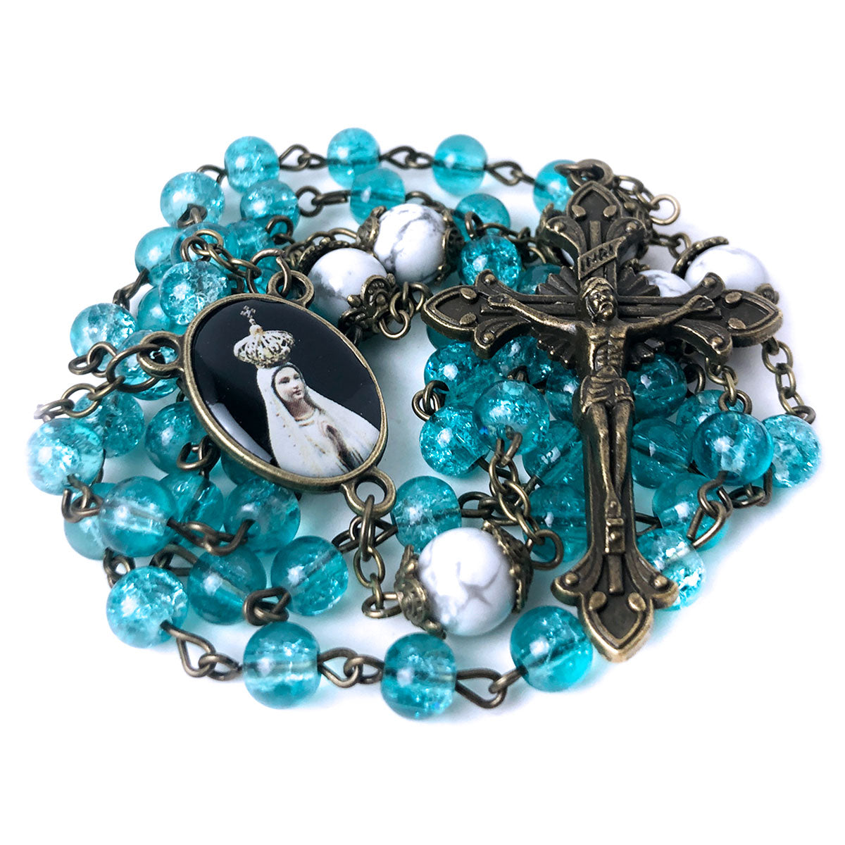 Our Lady of Fatima Aqua Crackle Glass and White Howlite Stone Catholic Rosary