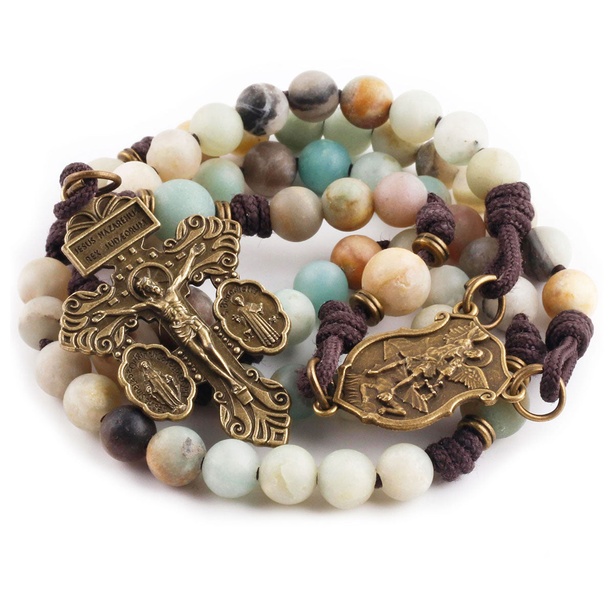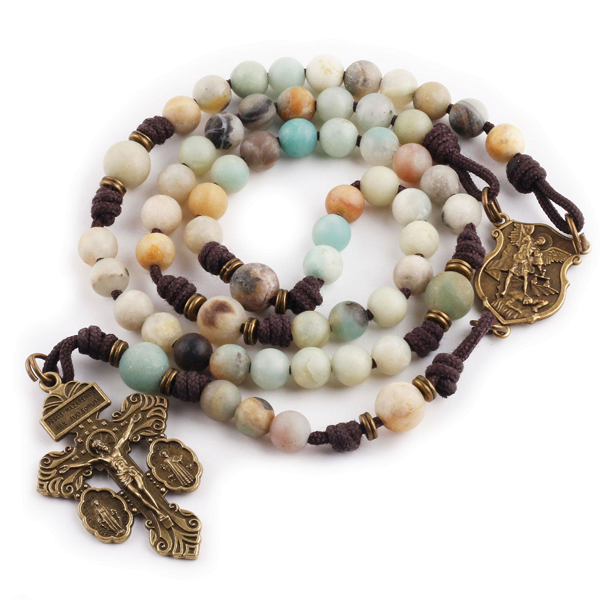 - Natural Amazonite Beads & Antique Bronze Accents: This beautiful rosary for women and men features natural Amazonite stone beads paired with a detailed St. Michael medal and ornate crucifix—crafted in antique bronze.